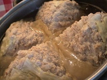 ●肉ダネを詰めると、キャベツが横に広がって十字に切った時よりも、ひとまわり大きくなりました。お鍋は大きめのものを~