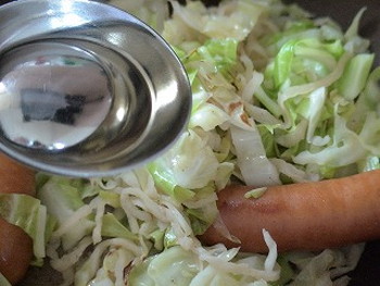 4.3の上にウインナーをのせて、皮が破れないようにごく弱火で蒸し煮する。キャベツがすっかり柔らかく煮えたら、ワインビネガーを混ぜて味を調え(写真右)、ふたをして約5分間煮る。