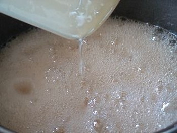 3.鍋にザルをのせて2を汁と身に分ける(写真左下)。汁の入った鍋を強火にかけ、アクを取りながら110度になるまで煮詰める(写真右下)。