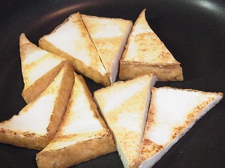 1.厚揚げは厚さ半分、さらに三角形になるように切り、フライパンで白い部分に焼き色がつくまでしっかりと煎り焼きする。焼き色がついたら取り出します。