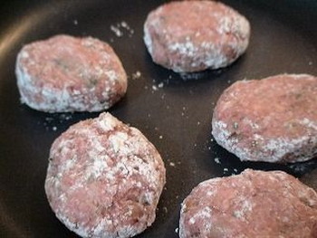 7.フライパンにオリーブ油(大さじ3)を熱し、肉だんごの両面に小麦粉をまぶして焼く。