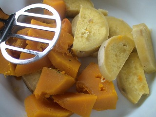 2.1のかぼちゃ、さつまいもを皮をむいて、ボウルの中でマッシャー(または、手で)潰します。