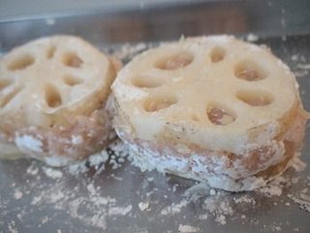 ※レンコンと肉ダネをつなげるためにつけます。小麦粉が接着剤になります