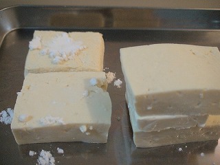 1.豆腐はまな板にのせ、5~10分間おいて自然に水気を切っておきます。