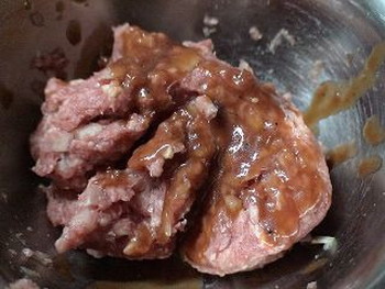 2.ボウルにミートローフの材料の合いびき肉から塩・こしょうまでを入れ、粘りが出るまでよく練り混ぜ、1のレンジドミグラスソース、たまねぎを加えてさらによく混ぜる。