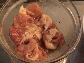 ペーパータオルで水気を拭き、酒、塩、こしょうで下味をつけて、片栗粉をまぶしておきます。
