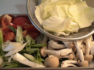 パプリカ、キャベツは食べやすい大きさに、長ネギは斜め切り(1.5cm幅くらい)、しめじは石づきを取り除き小房にほぐしておきます。