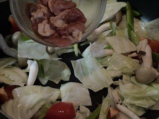 4.調味料のチキンスープ、砂糖、酒、しょう油、こしょうを加えて野菜がしんなりするまで煮込みます。