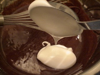 5.2のボウルに1を加え、泡立て器で円を描くようによく混ぜる。この時点でチョコレートは40℃ぐらいになっているのがよい。