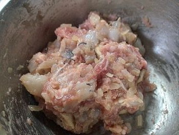 5. ボウルに1の豚肉、2のえびを入れ、塩、こしょうを加える。豚肉がちぎれて、えびとからむくらいまで練り混ぜる。