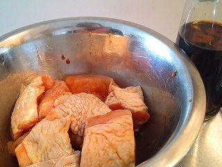 2.鶏肉(1枚250g)は約3cm角に切ります。ボウルに入れ、1のうまみじょうゆ(大1+1/2)を加えてからめ、5~10分間おきます。