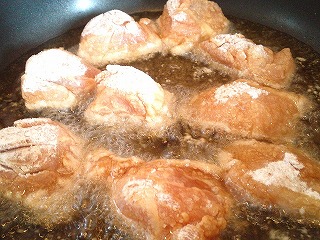 5.カラリとしてきたら、鶏肉を裏返し、こんがりと中まで火を通して 【鶏のから揚げ】の出来上がり