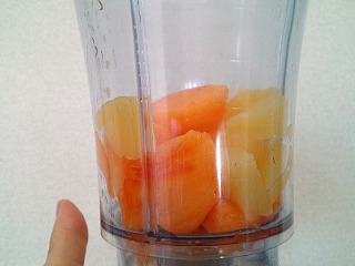 1.柿は皮をむき、種を取り除いてミキサーにかけやすい大きさに切ります(パイナップルも同様)。