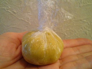 4.3の栗きんとん(1個30g)をさらしに包み、茶巾に形にします。