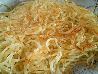 4.別のフライパンにサラダ油をひき、中華めんを入れて、両面がカリカリになるまで炒めて皿に盛ります。