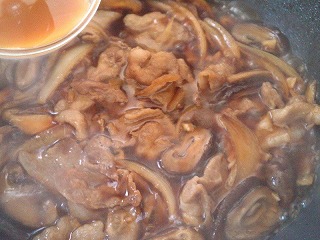 3.調味料のしょうゆ、酒、水、みりん、砂糖を加え、ふたをして弱火~中火で少し煮ます。