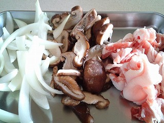 1.豚肉、玉ねぎ、しいたけを食べやすい大きさに、にんにくはみじん切りにします。