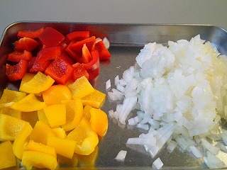 1.パプリカ(黄1個)は、縦半分に切りヘタ・種を取り除き1㎝四方に切ります。