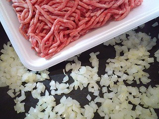 しんなり薄く色づいたら、合びき肉(200g)を加えてほぐしながら炒めます。