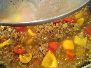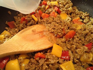 3.肉の色が変わったら、パプリカ、カレー粉(大2)を加えさらに炒めます。