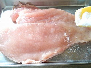 1.鶏むね肉は、白い筋があったら取り除いて砂糖、塩、コショウ、オリーブ油をまぶします。