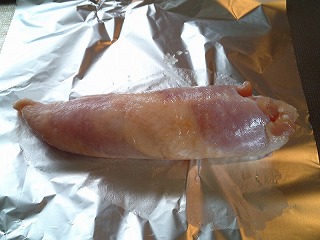 2.アルミホイル(包める30cmくらいの長さ)の上に、1の鶏肉を皮目を下にして置きます。