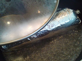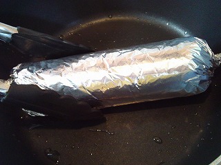 鶏肉をクルクルと棒状に形を整えて、アルミホイルで包み(密着させながら)、両端をつまみねじります(キャンディー)。