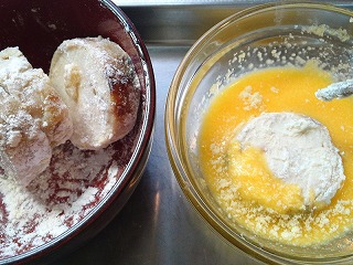 2.約1㎝厚切りの鶏ハムの両面に小麦粉をまぶして、1の卵液にくぐらせます。