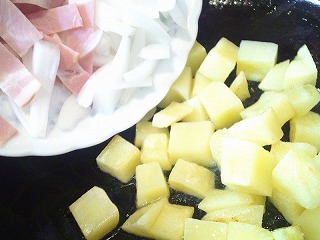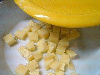 1.ジャガイモは2㎝角に切り、水に5分さらします。