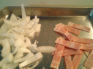 2.ベーコンは1㎝幅、タマネギは縦薄切りにします。