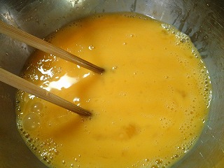 3.ボウルに卵を割り入れ、菜箸を使って40~50回ほど往復させよく溶きほぐします。