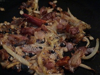 1.フライパンにエクストラバージンオリーブ油をひき、ベーコンを強めの中火で炒め(少し焦げるくらい)、そしてタマネギを透き通るくらいまで炒める。
