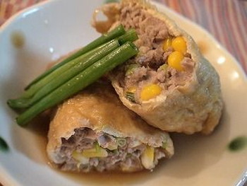 とうもろこしを挽き肉と一緒に油揚げに詰めて煮るレシピを紹介していました。