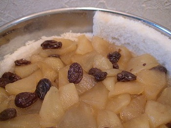 3.2の鍋に、レーズン、シナモンを加えて全体にザッと混ぜ合わせる。