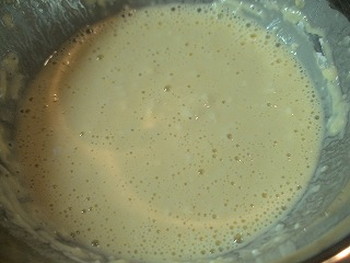 6.ボウルに衣の小麦粉、水、卵を入れて、ざっくりと混ぜ合わせます。(写真右)