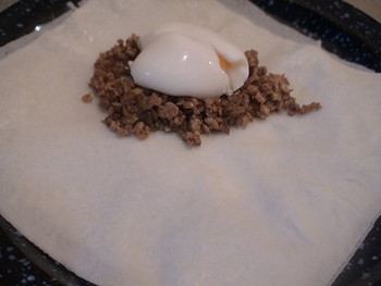 4.【A】を混ぜ合わせてのりをつくる。春巻の皮を2枚重ねて、皮の上部中央に3の半熟卵を置き、周りに2の挽き肉をのせる(写真右)。