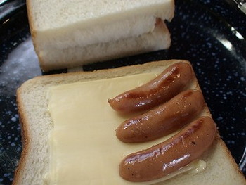 1.食パンは中央に浅く切り目を入れるウインナソーセージは縦半分に切って、表面に浅い切り目を斜めに数本入れる。(私は軽く炒めました)
