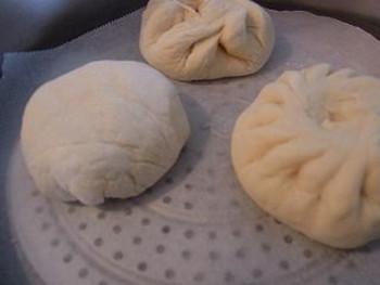 ※ひだを作るように包んだら、逆さにし、ひだの部分をまな板にこすりつけて平らに、 形を細長くするとよい(肉まんと区別をつけるため)