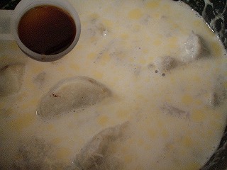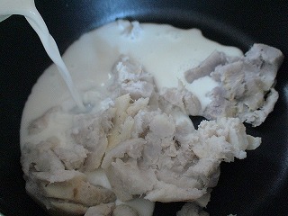1.鍋に軽くつぶしたサトイモと牛乳、水、酒、バターを加えます。