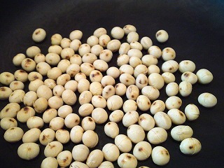 1.フライパンに大豆を入れ、豆にひびが入り焼き色がつくまで中火でしっかりと煎ります。