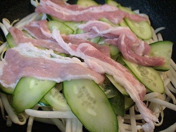 2.テフロン加工のフライパンに、油をひかずに火を付ける前に、もやし、スライスした半量のキュウリ、 2/3の豚バラ肉、残りのキュウリ、豚バラ肉の順で重ねる。
