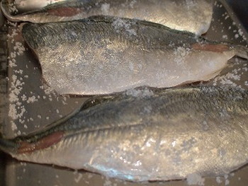 3.30分後アジを取り出し、水で洗い流し、ふき取る。味付けとして塩、コショウ、ショウガ汁を振りかける。