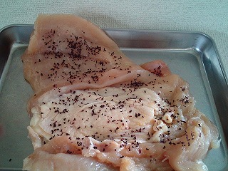 1.鶏むね肉(250g)を観音開きにし、皮を上にしてゆかり(小1/2)を振りかけます。