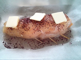 水(大3)、酒(大1)、ゆかり(小1/2)を合わせて肉にかけ、バター(10g)を3箇所に分けてのせ、クッキングシートをキャンディーのように包みます。