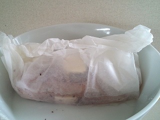 3.耐熱容器にクッキングシートを広げて、2の鶏肉を巻き終わりを下にして置きます。