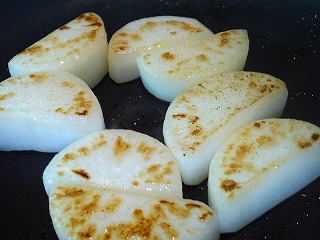 3.2のフライパンの余分な脂を捨ててから、大根を並べ焼き目をつけて取り出します。