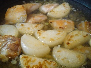 透き通ったら水をひたひたになるくらいまで入れ、肉、大根を戻し入れて、灰汁を取りながら10分ほど煮ます。