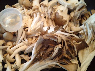 1.エリンギは食べやすい大きさにカットし、マイタケ、ブナシメジは石づきを取り除きほぐしたら、フライパンに入れ、酒を全体にふってまぶし火にかけます。
