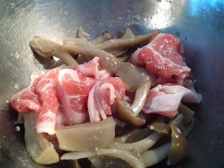 1.ボウルに豚肉と塩麹キノコを揉み合わせます。