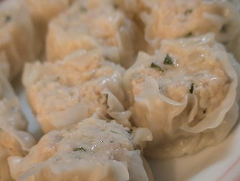 2.一口大のボール状に丸め、シュウマイの皮に包んで10分蒸らし、出来上がり